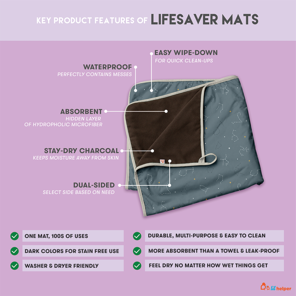 With multi-use, waterproof, reusable, and absorbent features, Lifesaver Mats are perfect for spills, accidents, and everyday messes. Lifesaver Mat: One mat, 100s of uses!