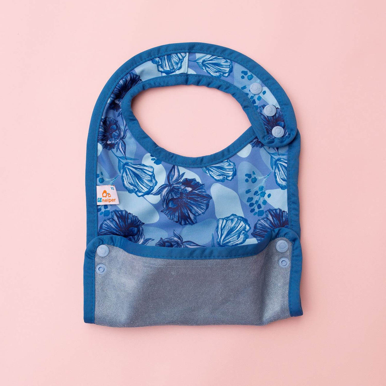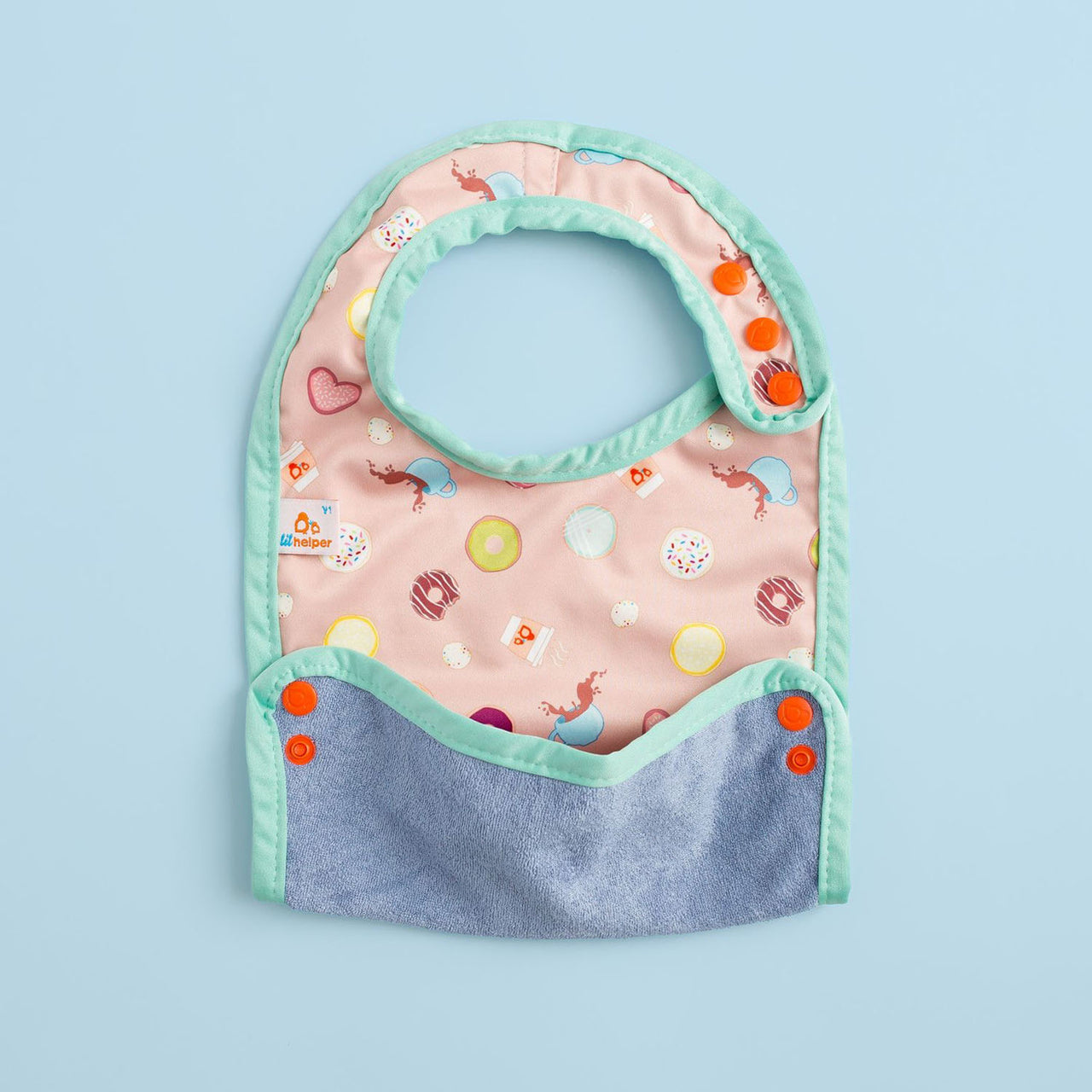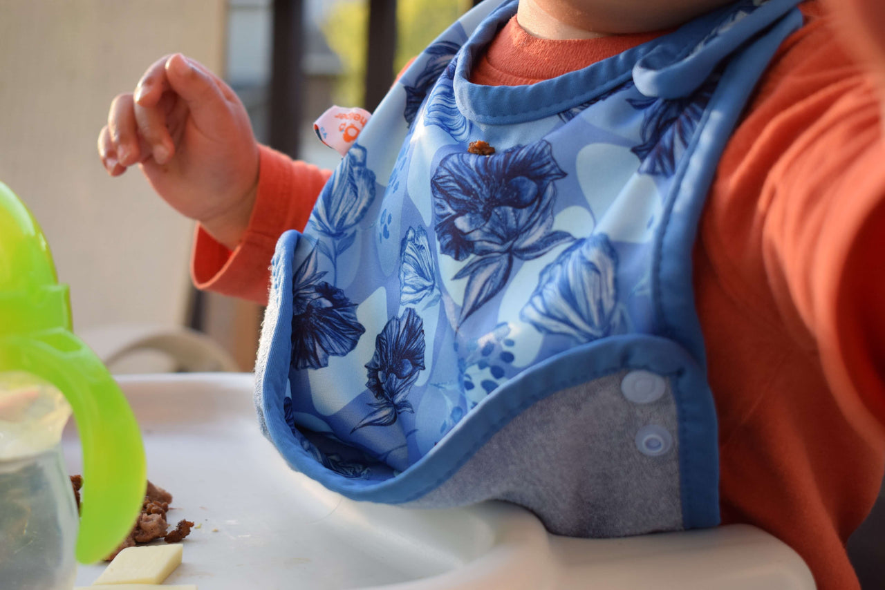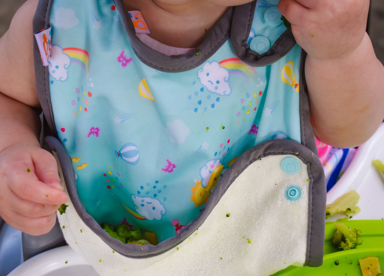 Generous coverage and a versatile food-catching feature make mealtime more manageable—even for the most enthusiastic eaters. The food catcher snaps on either side to catch spills and crumbs, helping keep floors and clothes cleaner. Perfect for babies learning to self-feed and enthusiastic eaters who keep you on your toes.