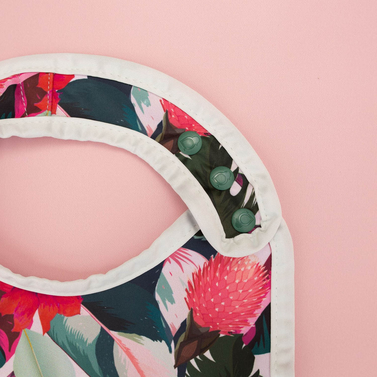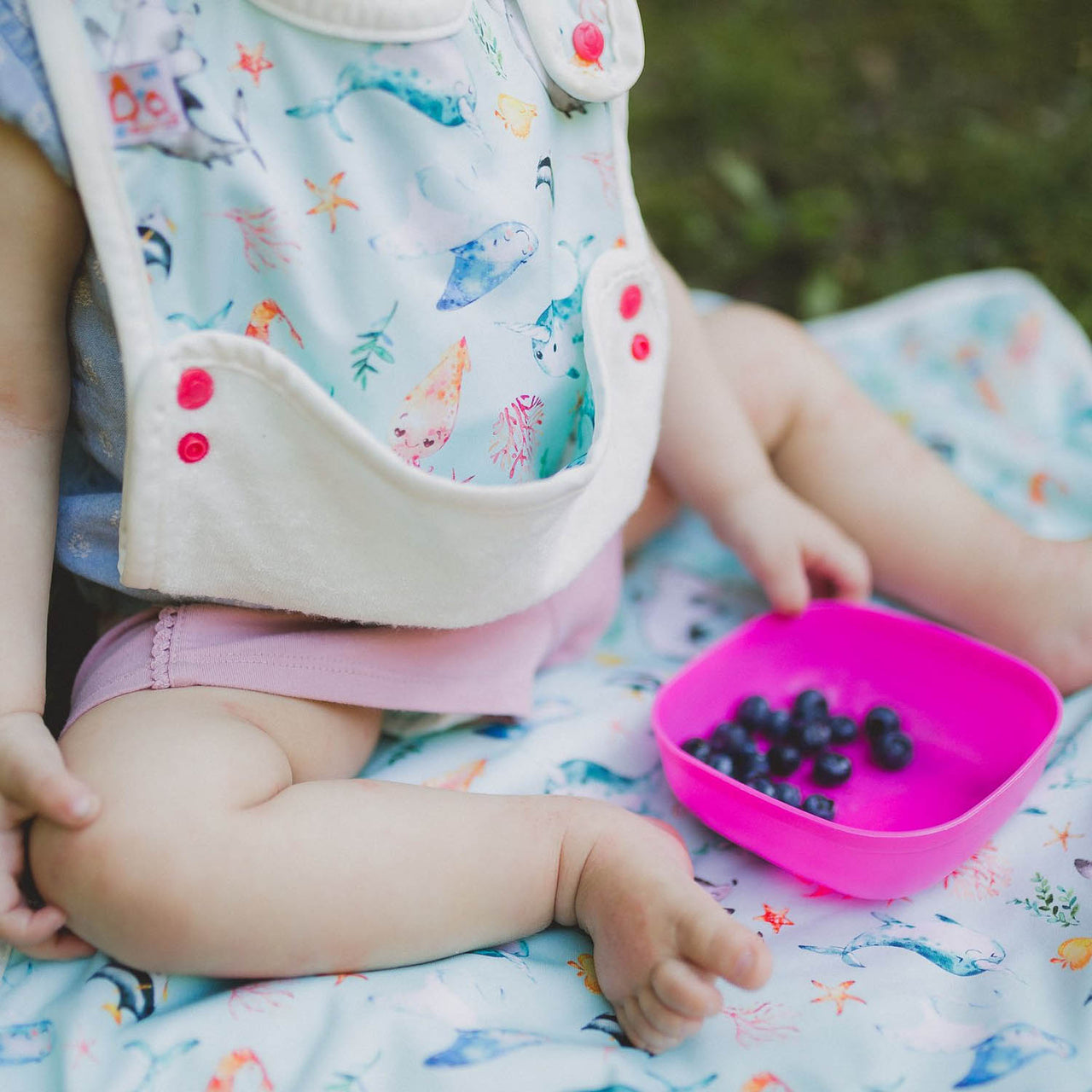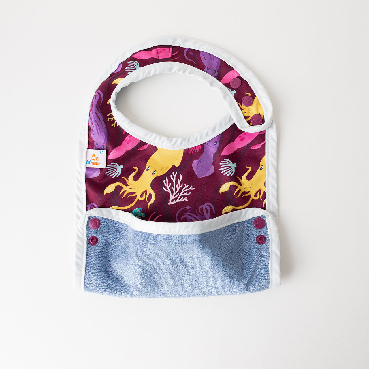 Generous coverage and a versatile food-catching feature make mealtime more manageable—even for the most enthusiastic eaters. The food catcher snaps on either side to catch spills and crumbs, helping keep floors and clothes cleaner. Perfect for babies learning to self-feed and enthusiastic eaters who keep you on your toes.