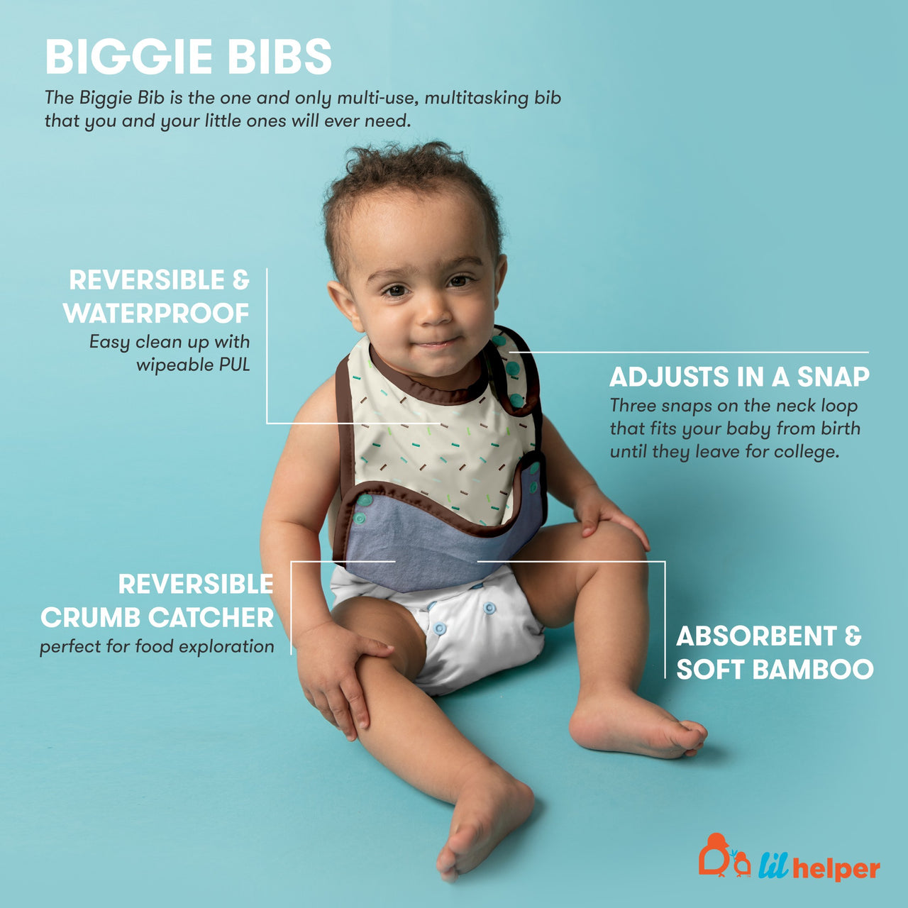 Use the PUL side as a protective apron for messy art projects or outdoor play, adding extra value beyond mealtime. The soft bamboo terry side provides absorbency and comfort against your baby’s skin. Adjustable snaps ensure a perfect fit from newborn to toddler, adapting to your child’s growth and activities. A must-have for snacks, solids introduction, and everyday mess control.